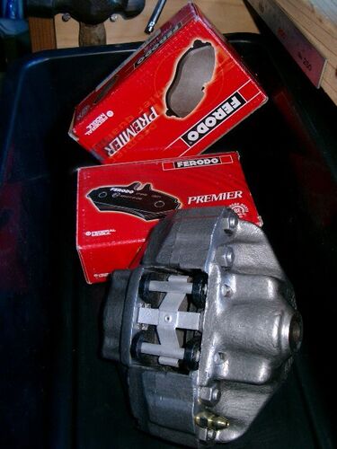 日曜日に時間を見つけ、ブレーキ回りの組み付けを開始しました。まずOHしたキャリパーに新しいパッドを組み付け。前にセールで前後セットで6000円だった時に買った物。結構安いでしょ。ん~、なかなかいい感じ。次にブレーキホースを交換。ステンメッシュの…
